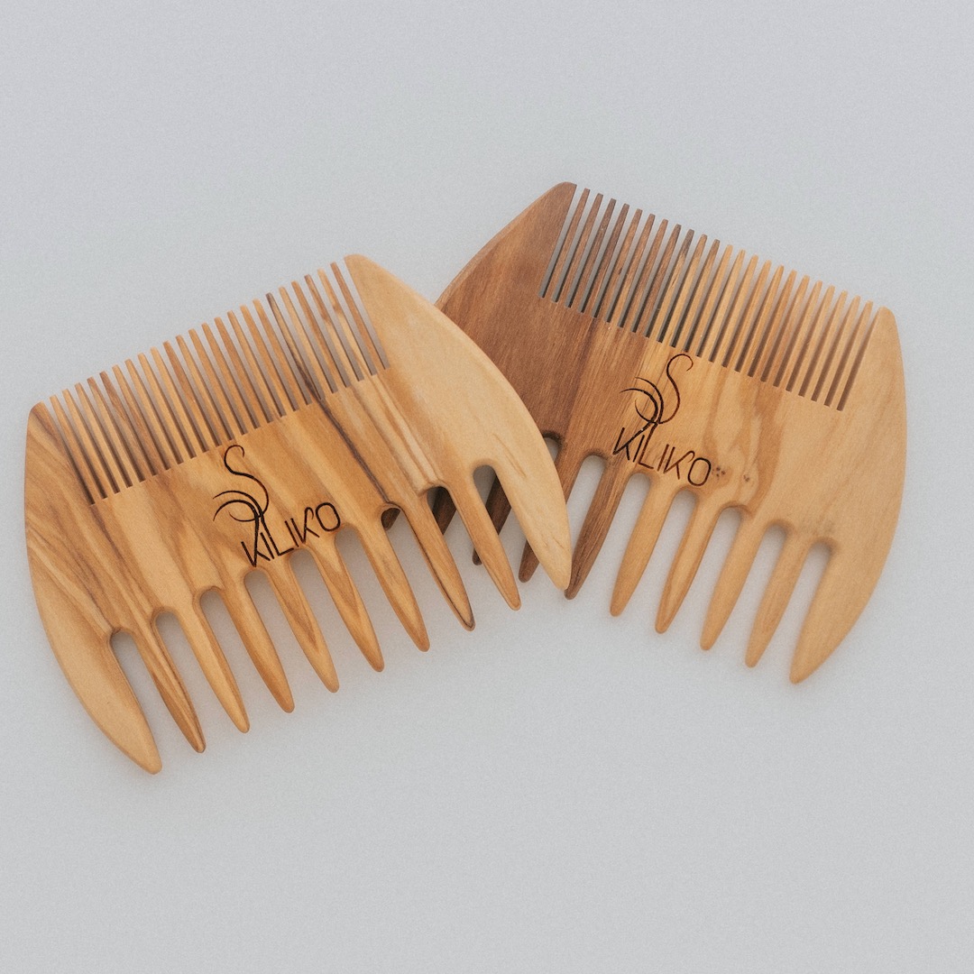 Pettine doppio realizzato in pregiatissimo legno di Olivo, caratterizzato da due dentature differenti, rada e fitta.